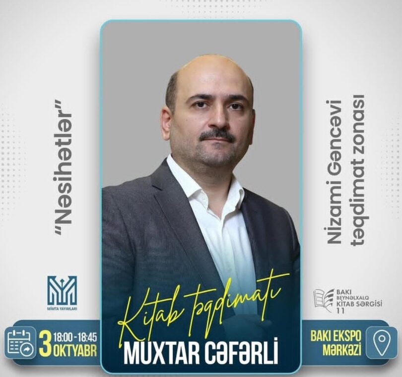 Mədəniyyət Nazirliyinin təşkilatçılığı ilə oktyabrın 1-dən 7-dək Bakı Ekspo Mərkəzində keçiriləcək 11-ci Bakı Beynəlxalq Kitab Sərgisində araşdırmaçı-yazar Muxtar Cəfərlinin “Qəlbini nəsihətlə dirilt” kitabının təqdimat mərasimi olacaq.