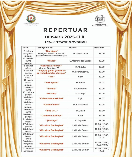 Xəbərlər Milli Dram Teatrının dekabr repertuarı açıqlanıb 2 ay əvvəl Azərbaycan Dövlət Akademik Milli Dram Teatrının dekabr repertuarı açıqlanıb. “Füyuzat” repertuar planını təqdim edir. FacebookXWhatsApp