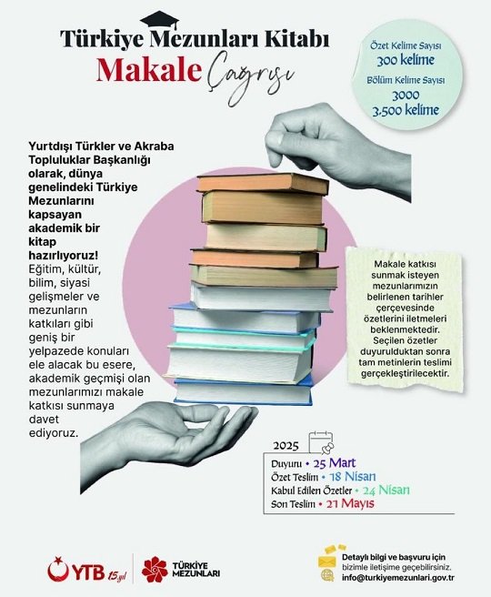 “Türkiyə məzunlarımızın nailiyyətləri bu kitabda bir araya gətirilir. Təhsil, mədəniyyət, elm, siyasi inkişaflar və məzunlarımızın bu sahələrdəki təsirlərini özündə əks etdirəcək “Türkiyə Məzunları Akademik Kitabı”na sən də məqaləni yaza bilərsən”.